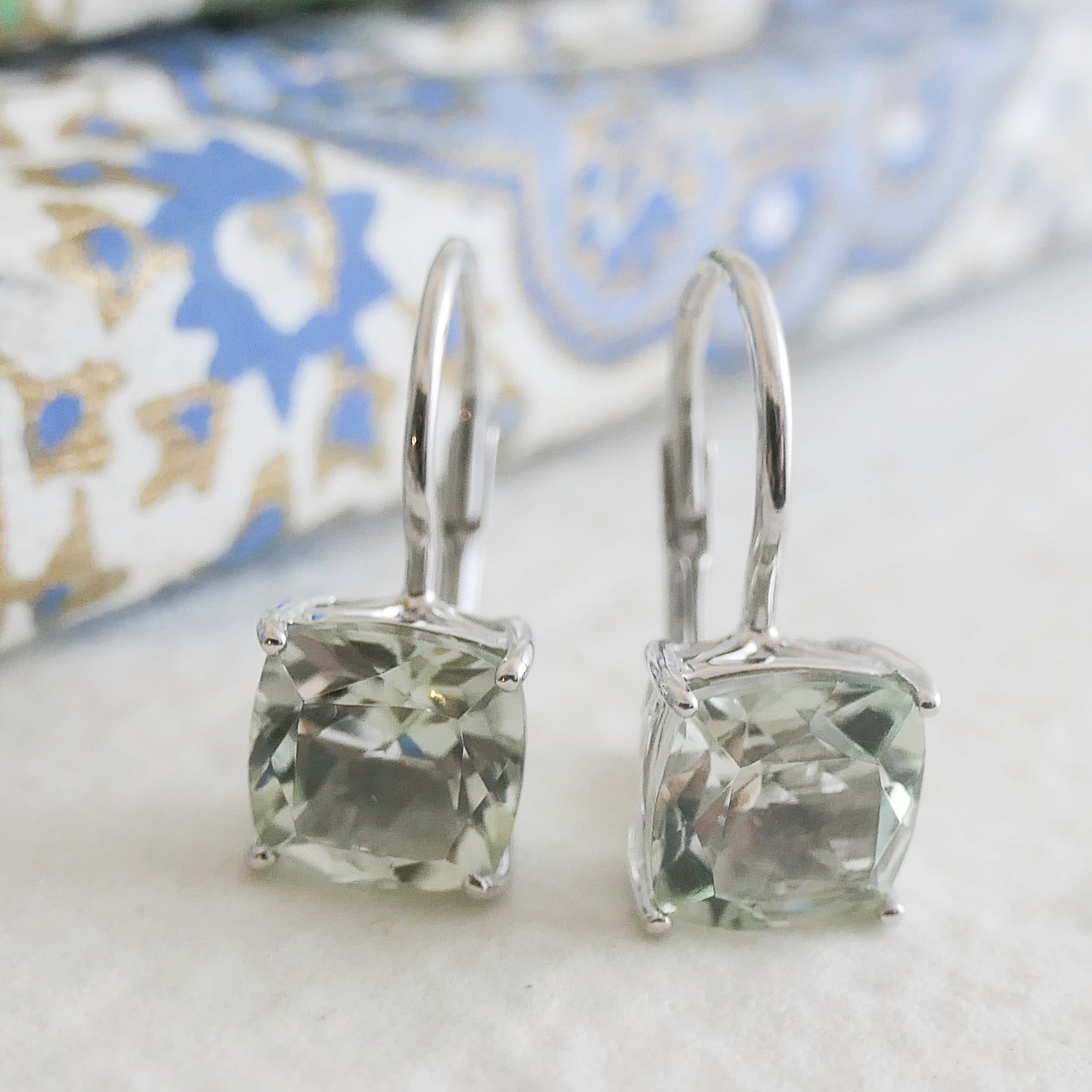 ✦✦ Faceted 9x9mm cushion cut green amethyst are set in sterling silver and then soldered to sterling silver leverbacks.
