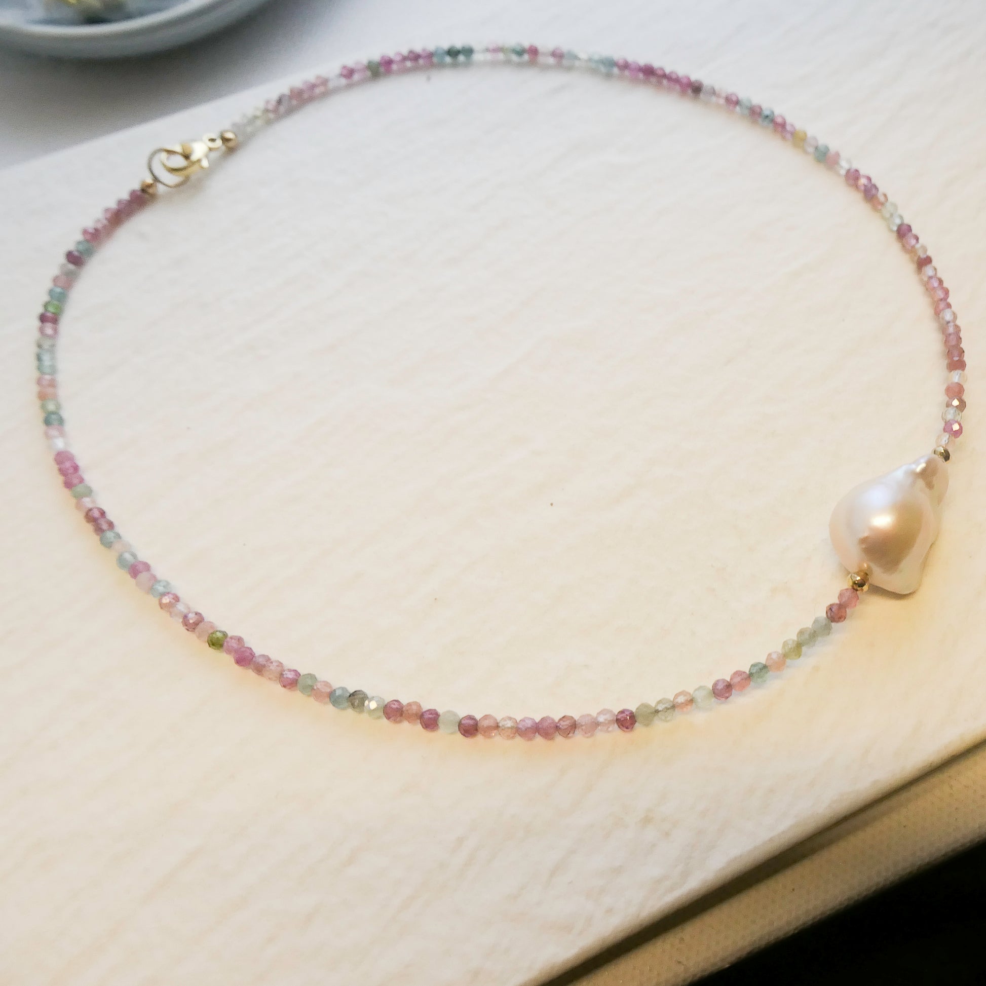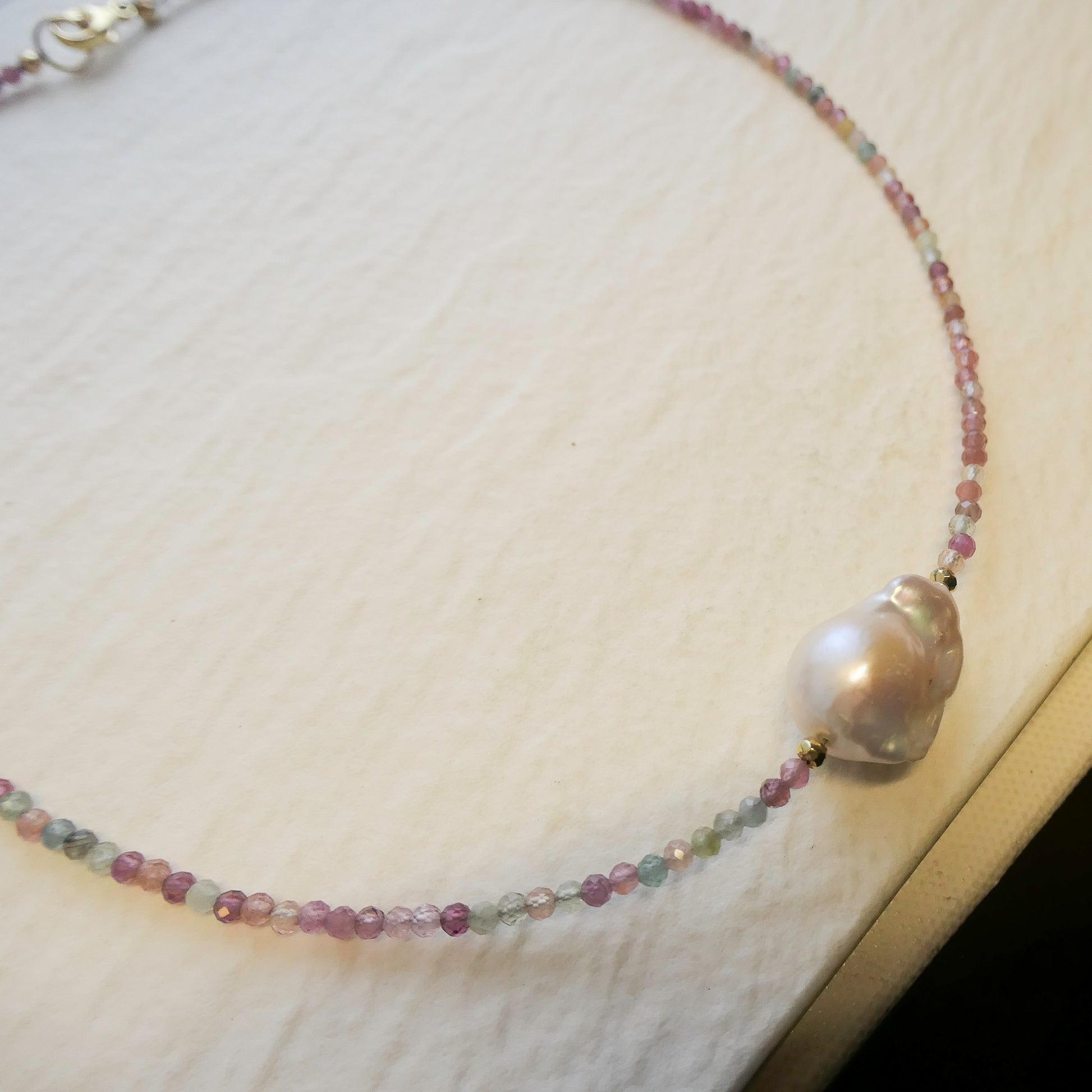 This delicate necklace is handcrafted with 3 mm natural multi-colored tourmaline beads, showcasing soft, harmonious shades that make each piece truly unique. At the center sits a baroque freshwater pearl, chosen for its organic shape and luminous glow.